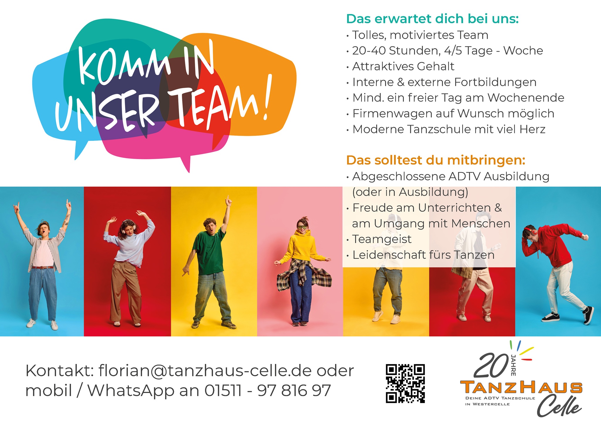 Wir freuen uns immer über eine aussagekräftige, nette Bewerbung. Diese kann gern per E-Mail an florian@tanzhaus-celle.de, per WhatsApp an 01511- 97 816 97 oder gern auch schriftlich direkt in unserem Tanzschulbüro - Lindenallee 7, 29227 Celle - eingereicht werden.